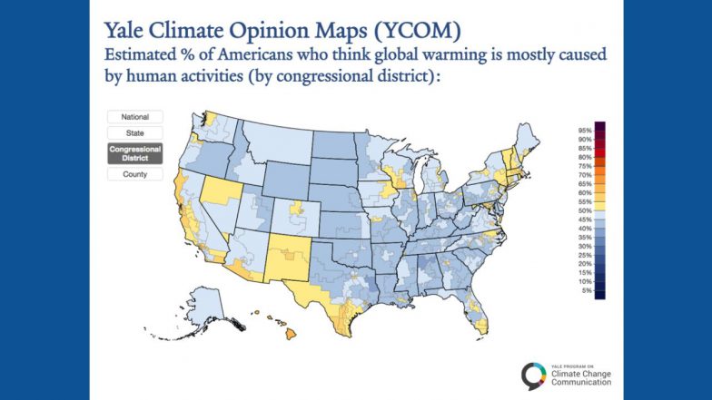 YPCCC has collaborated with the George Mason Center for Climate Change Communication to assemble a freely available dataset, which has been used to create interactive partisan climate opinion maps of the United States.[4][5][6] These maps, also known as the Yale Climate Opinion maps, provide detailed information about "climate change beliefs, risk perception and policy support for climate-related policy at the state and local level."[7] In July 2019, the organization suggested that discussing climate change more frequently with family and friends might be the most effective way of influencing United States public opinion on climate change.[8][9]